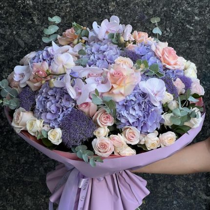 Авторский букет: орхидея розовая, диантус персиковый и роза розовая Маритим