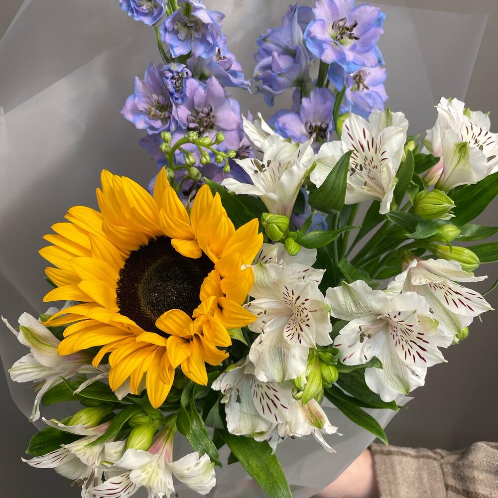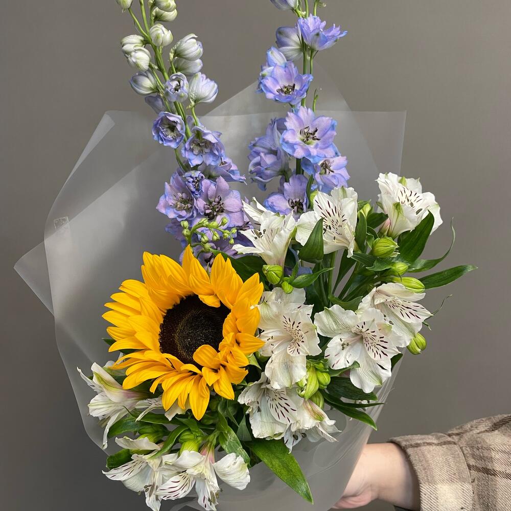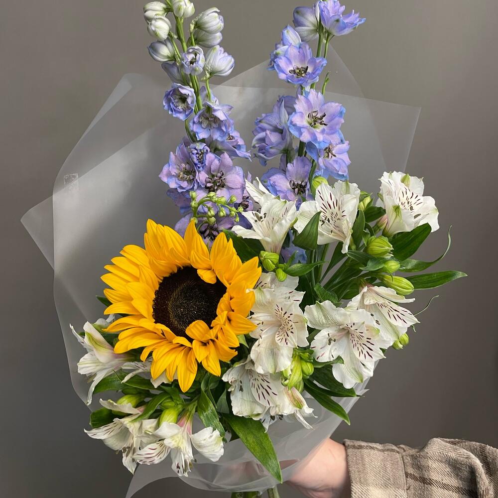 Альстромерия – 4 шт.Дельфиниум – 2 шт.Лента атласная – 1 шт.Подсолнух – 1 шт.Упаковка дизайнерская – 1 шт.