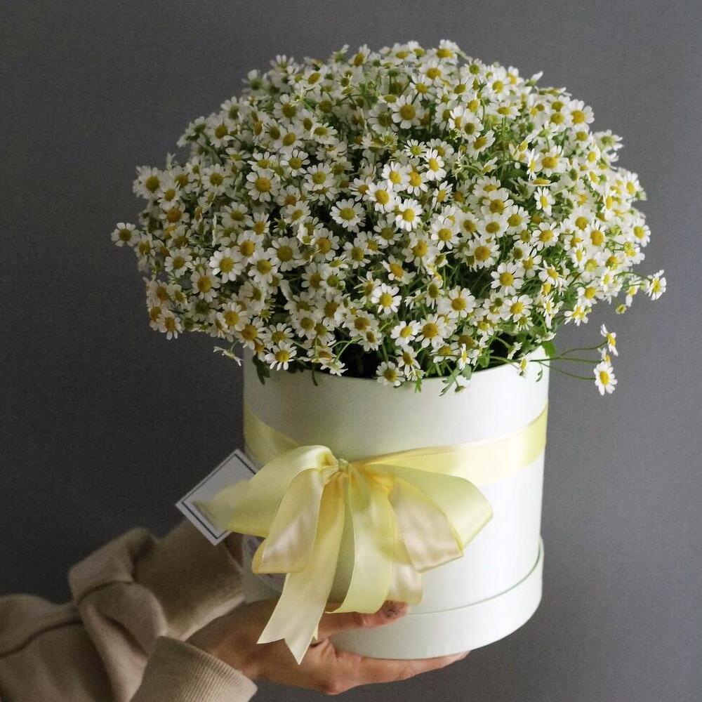 Матрикария – 15 шт.Шляпная коробка – 1 шт.Атласная лента – 1 шт.