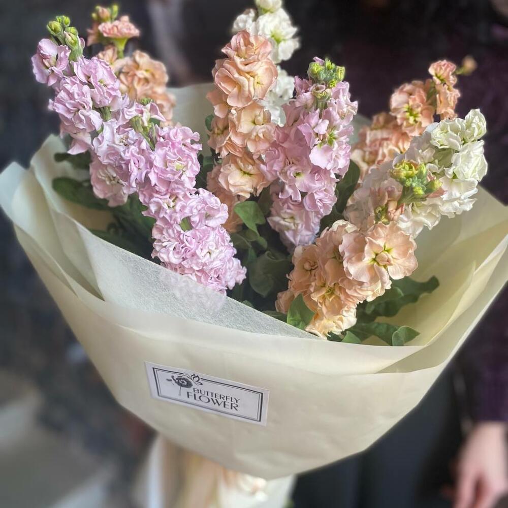Букет из 9 разноцветных маттиол в стильной упаковке “Персиковый плен”