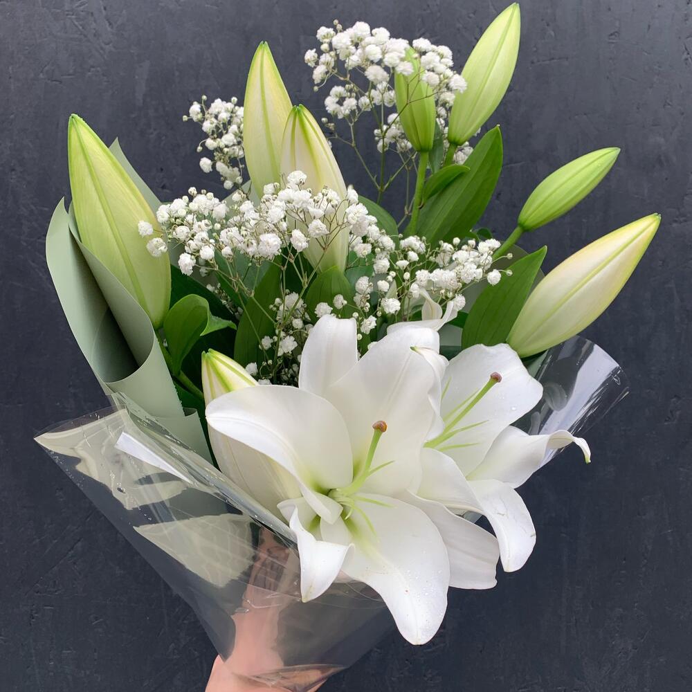Лилия – 3 шт.Гипсофила – 1 шт.Упаковка дизайнерская – 2 шт.