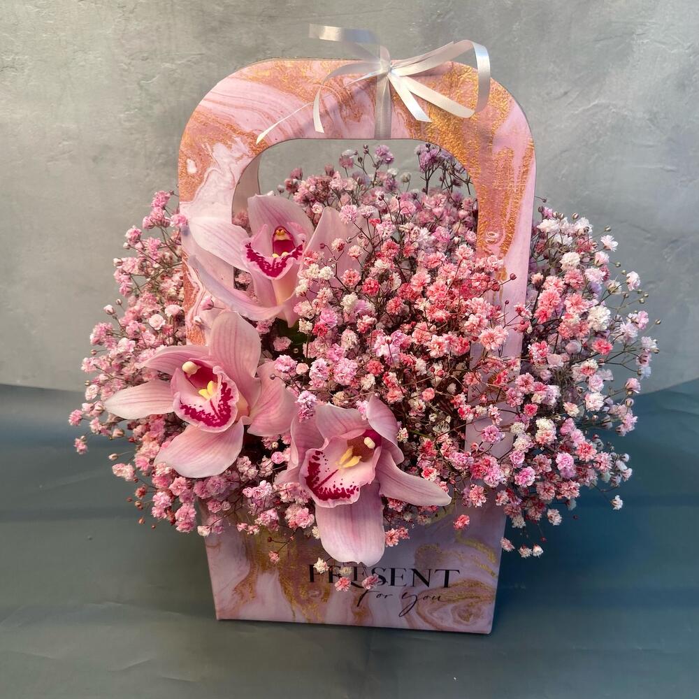 Гипсофила – 6 шт.Орхидея Цимбидиум – 3 шт.Лента атласная – 2 шт.Оазис флористический – 1 шт.Сумка крафт – 1 шт.