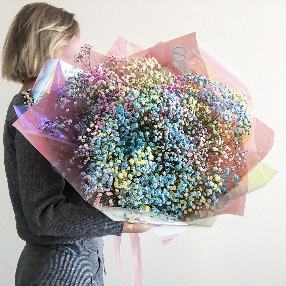 гипсофила радужная – 11 шт.Пленка корейская – 2 шт.пленка радужная – 2 шт.Лента атласная – 1 шт.
