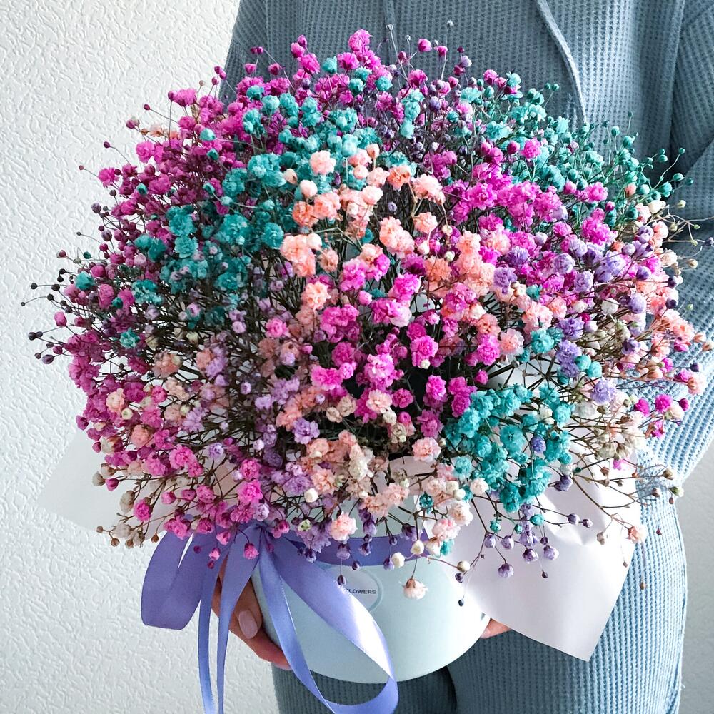 гипсофила радужная – 9 шт.Оазис флористический – 2 шт.Коробка шляпная – 1 шт.Лента атласная – 2 шт.
