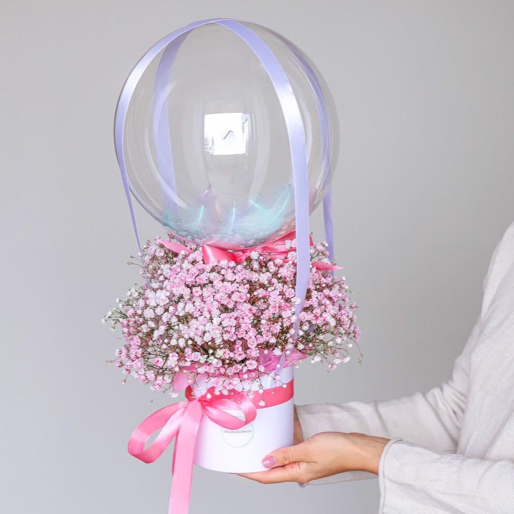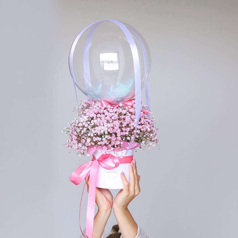 гипсофила цветная – 5 шт.шар баббл с перьями – 1 шт.Коробка шляпная – 1 шт.Лента атласная – 5 шт.Тишью – 1 шт.Упаковка транспортировочная пленка – 1 шт.инструкция по уходу за цветами – 1 шт.