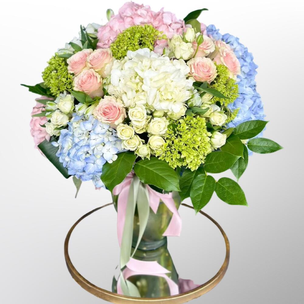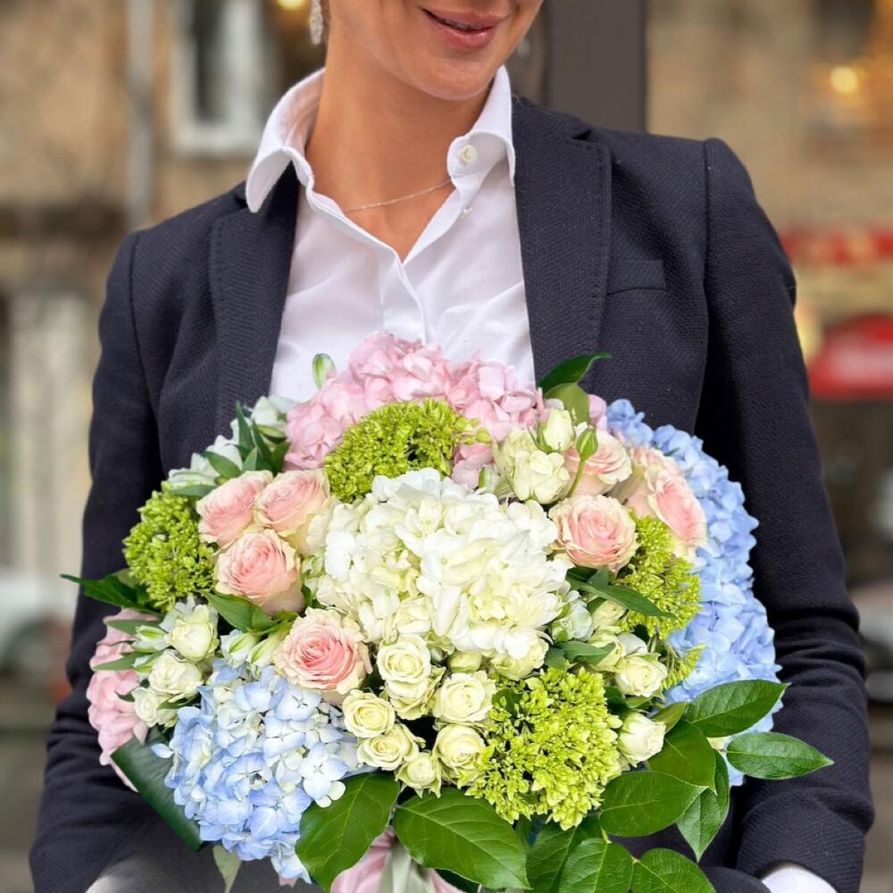Гвоздики, Гортензии, Кустовые розы, Лизиантусы, Розы