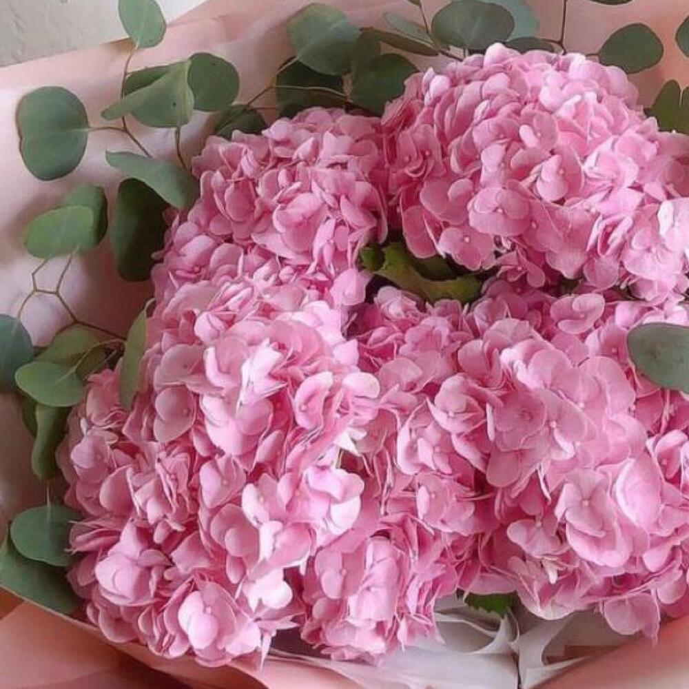 Гортензия розовая – 5 шт.Эвкалипт – 10 шт.Упаковка дизайнерская – 2 шт.Лента атласная – 2 шт.Открыточка с вашими пожеланиями – 1 шт.хорошее настроение – 100 шт.инструкция по уходу за цветами – 1 шт.коробка переноска – 1 шт.Кризал – 1 шт.