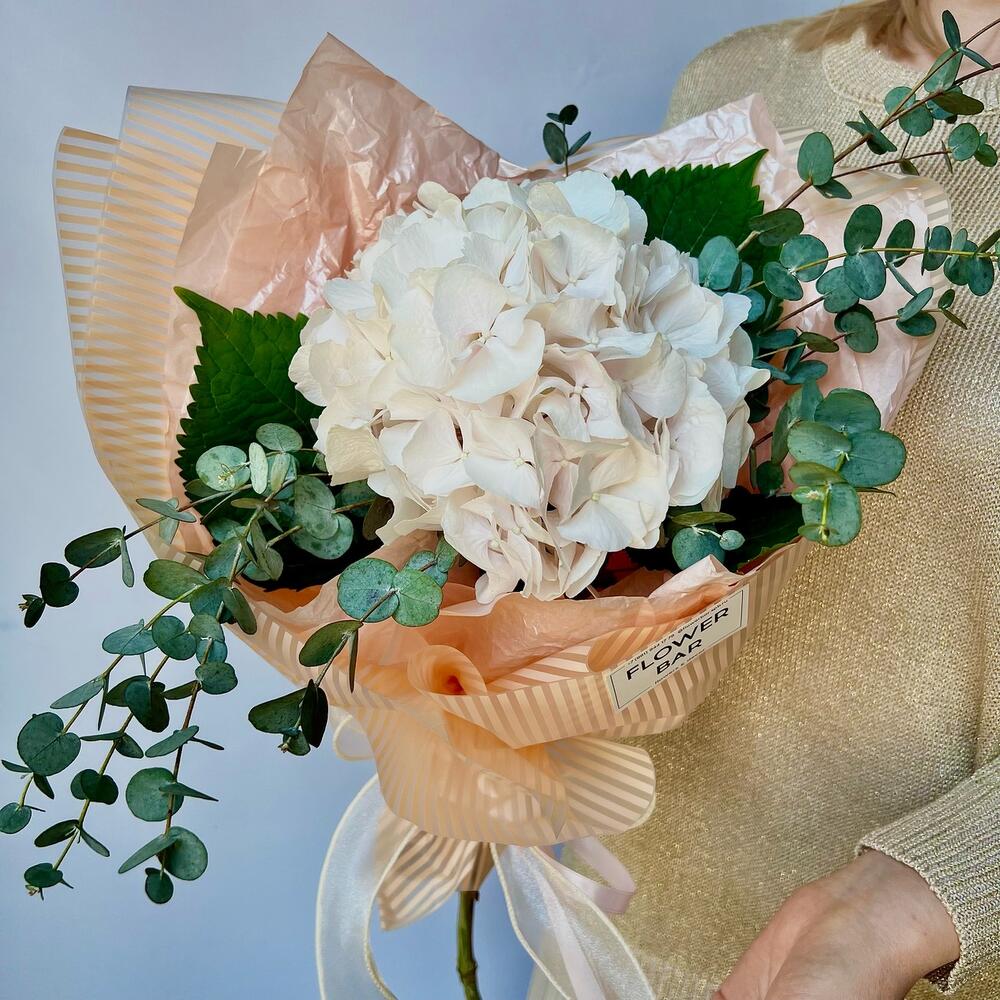 Гортензия – 1 шт.Эвкалипт – 2 шт.Лента атласная – 1 шт.Упаковка дизайнерская – 1 шт.