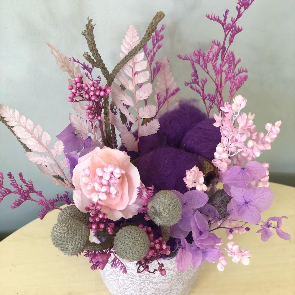 Керамическое кашпо – 1 шт.Гортензия – 1 шт.Папоротник – 1 шт.Бруния – 1 шт.Лимониум – 1 шт.