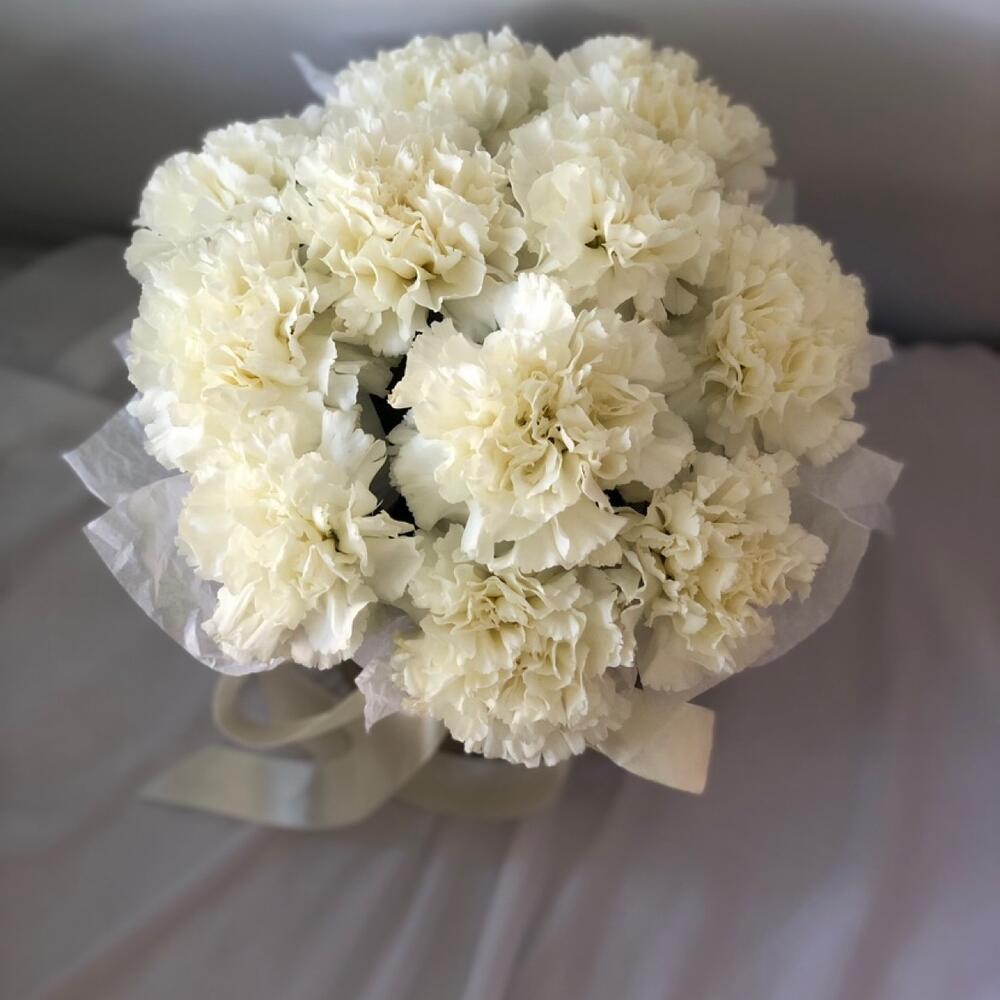 11 белых гвоздик в шляпной коробке
