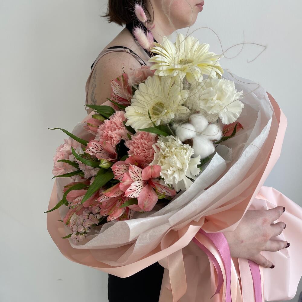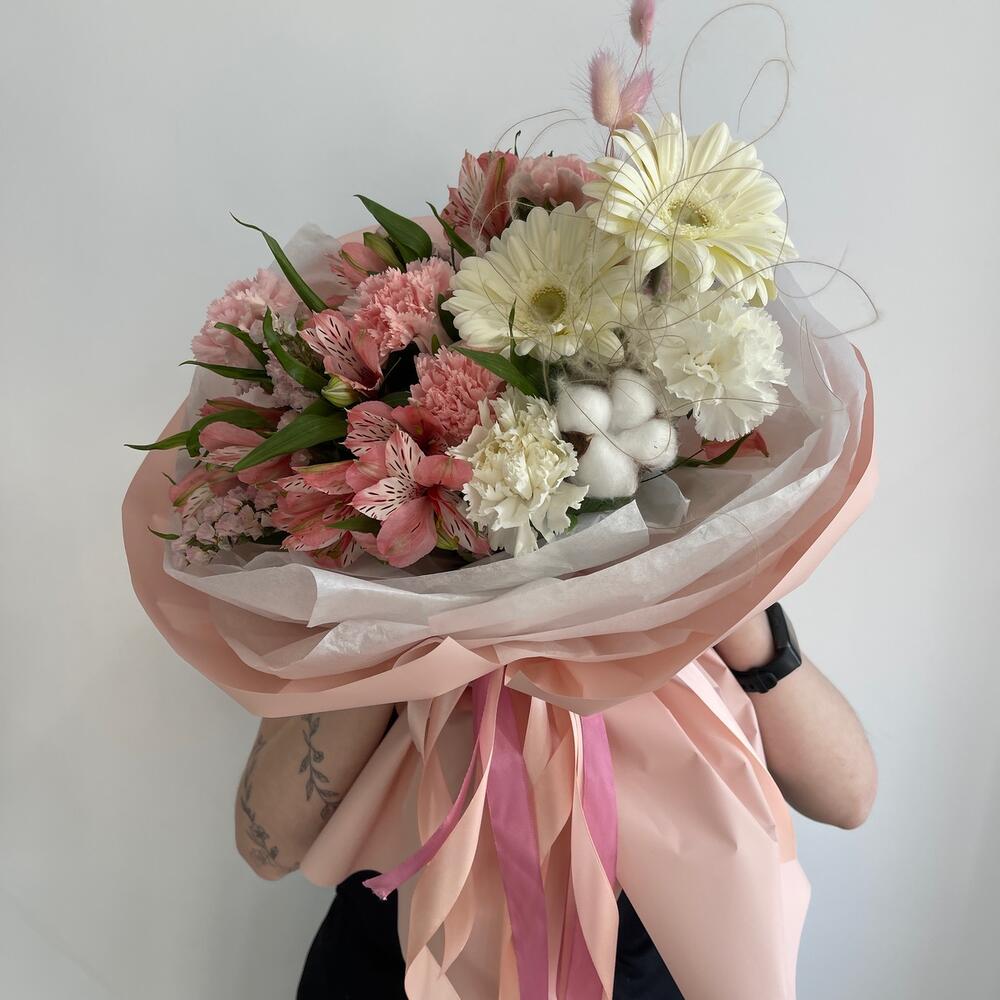 Альстромерия – 5 шт.Статица – 1 шт.Хлопок – 2 шт.Лента атласная – 2 шт.Гербера – 2 шт.Диантус – 7 шт.Фисташка – 2 шт.Упаковка дизайнерская – 4 шт.Лагурус – 5 шт.Стифа – 1 шт.