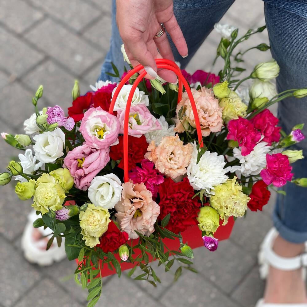Гвоздика – 7 шт.Эустома – 4 шт.Пистация – 2 шт.Оазис флористический – 1 шт.Сумочка – 1 шт.