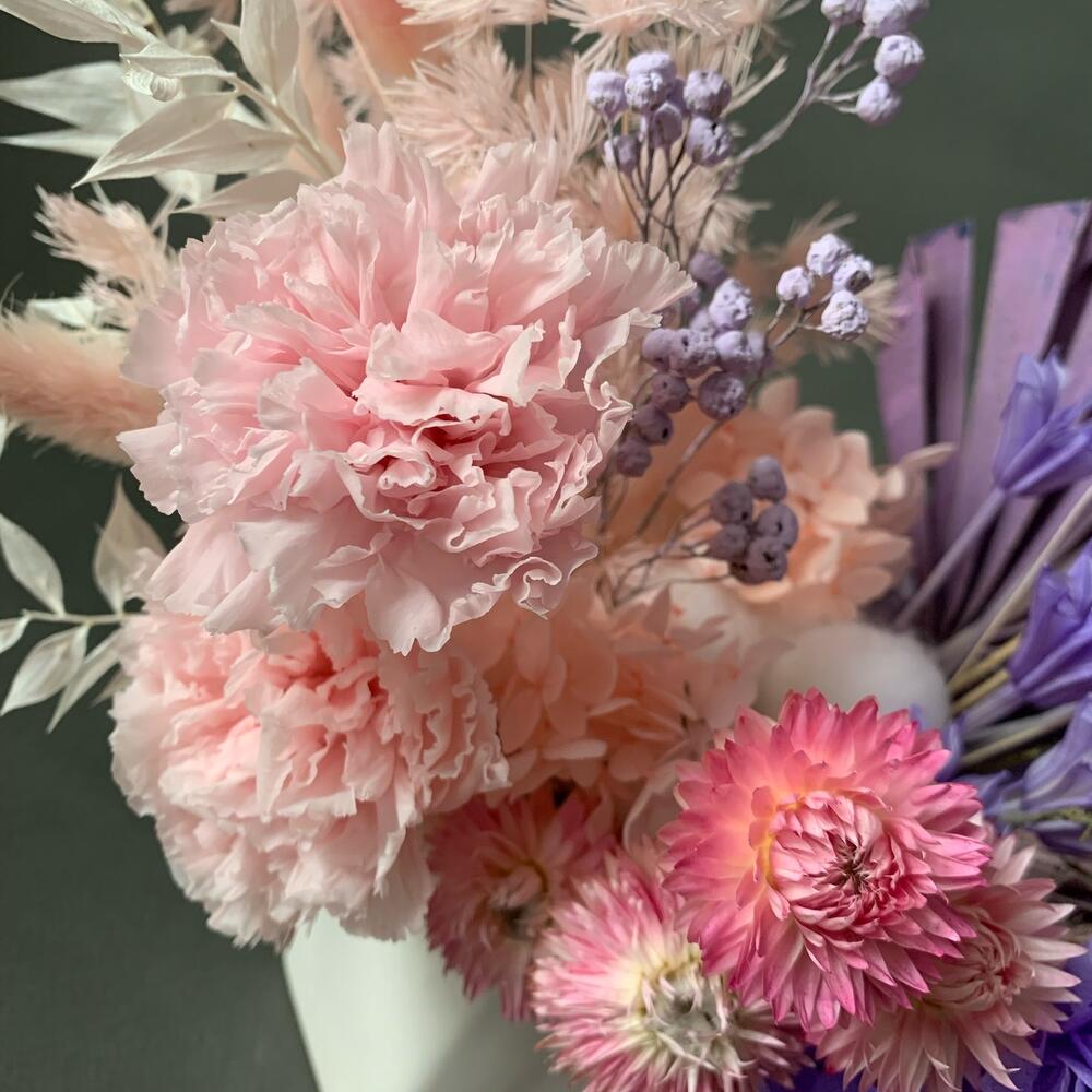 Кашпо керамическое – 1 шт.пальма пика – 1 шт.листья магнолии крашенные – 3 шт.Краспедия – 3 шт.гвоздика стабилизированная – 2 шт.Гелихризум – 4 шт.иглица стабилизированная – 1 шт.Лагурус – 20 шт.Лимониум – 3 шт.пижма крашеная ветка – 2 шт.аспарагус стабилизированный – 4 шт.гортензия стабилизированная розовая – 2 шт.гортензия стабилизированная фиолетовая – 4 шт.Хлопок – 1 шт.Озотамнус розовый – 5 шт.Нигелла сухоцвет – 8 шт.Оазис флористический – 1 шт.колосья крашенные – 6 шт.пленка прозрачная упаковочная – 1 шт.крафт пакет с ручками – 1 шт.