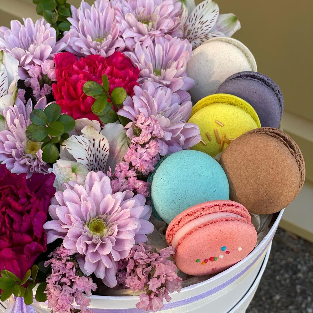 Набор: цветы и макарунс в шляпной коробке