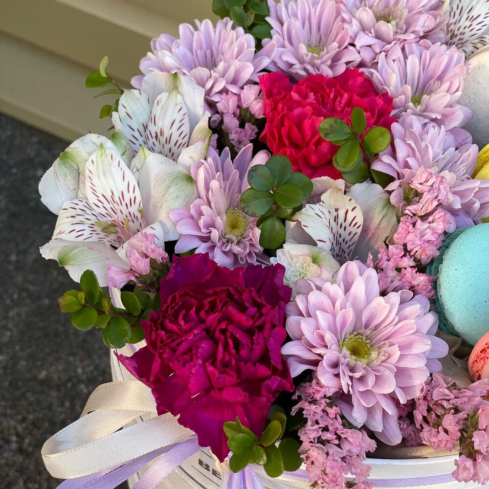 Альстромерия – 1 шт.Статица – 1 шт.Хризантема кустовая – 1 шт.Гвоздика – 2 шт.Тишью – 2 шт.Коробка шляпная – 1 шт.Самшит – 1 шт.Оазис флористический – 1 шт.макарон (пирожное) – 6 шт.