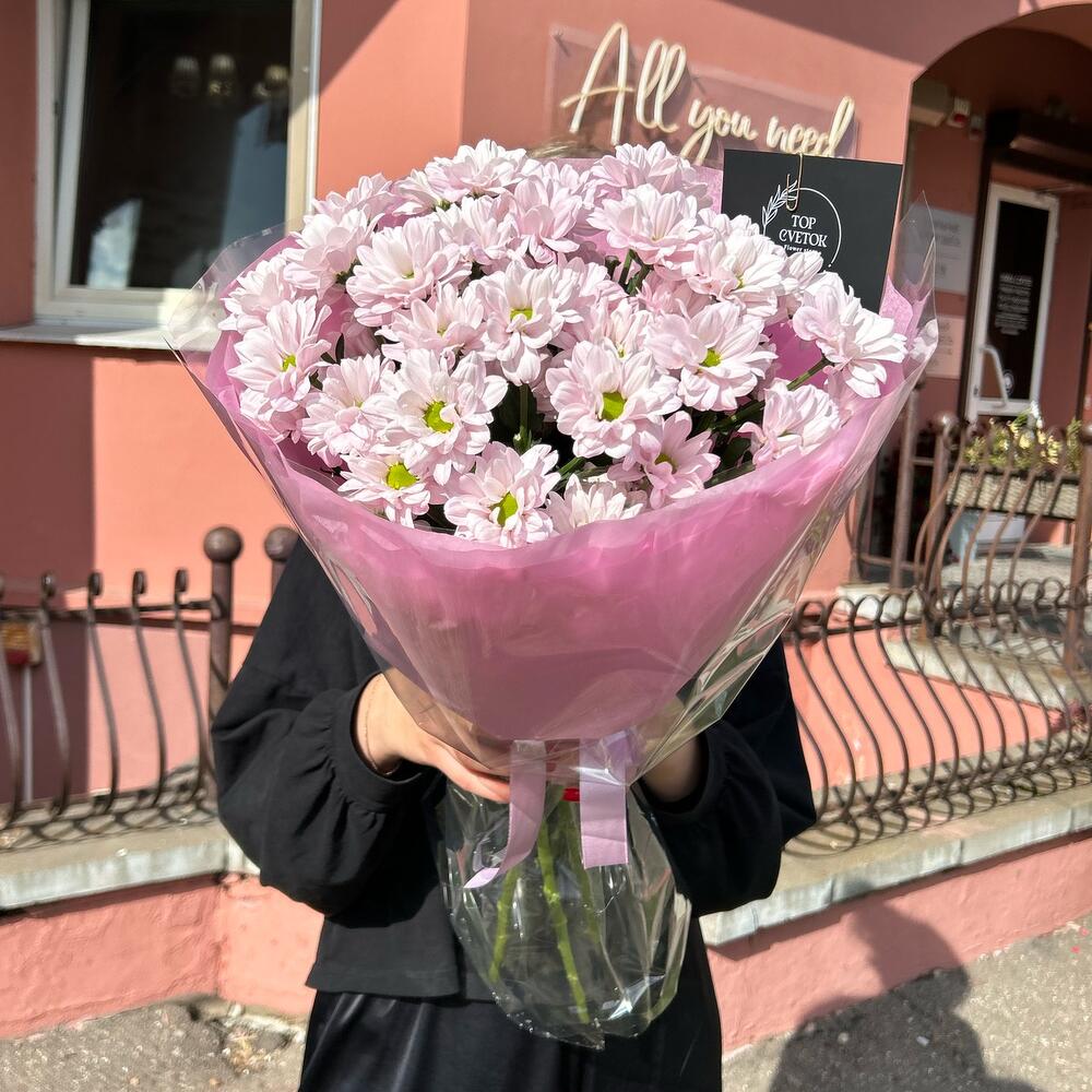 Букет из 5 веток ромашковой хризантемы в дизайнерском оформлении , количество ромашек в букете может достигать 51 шт.