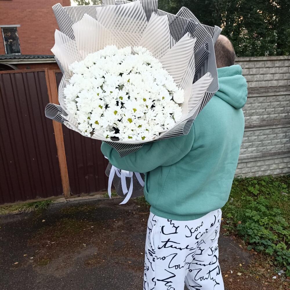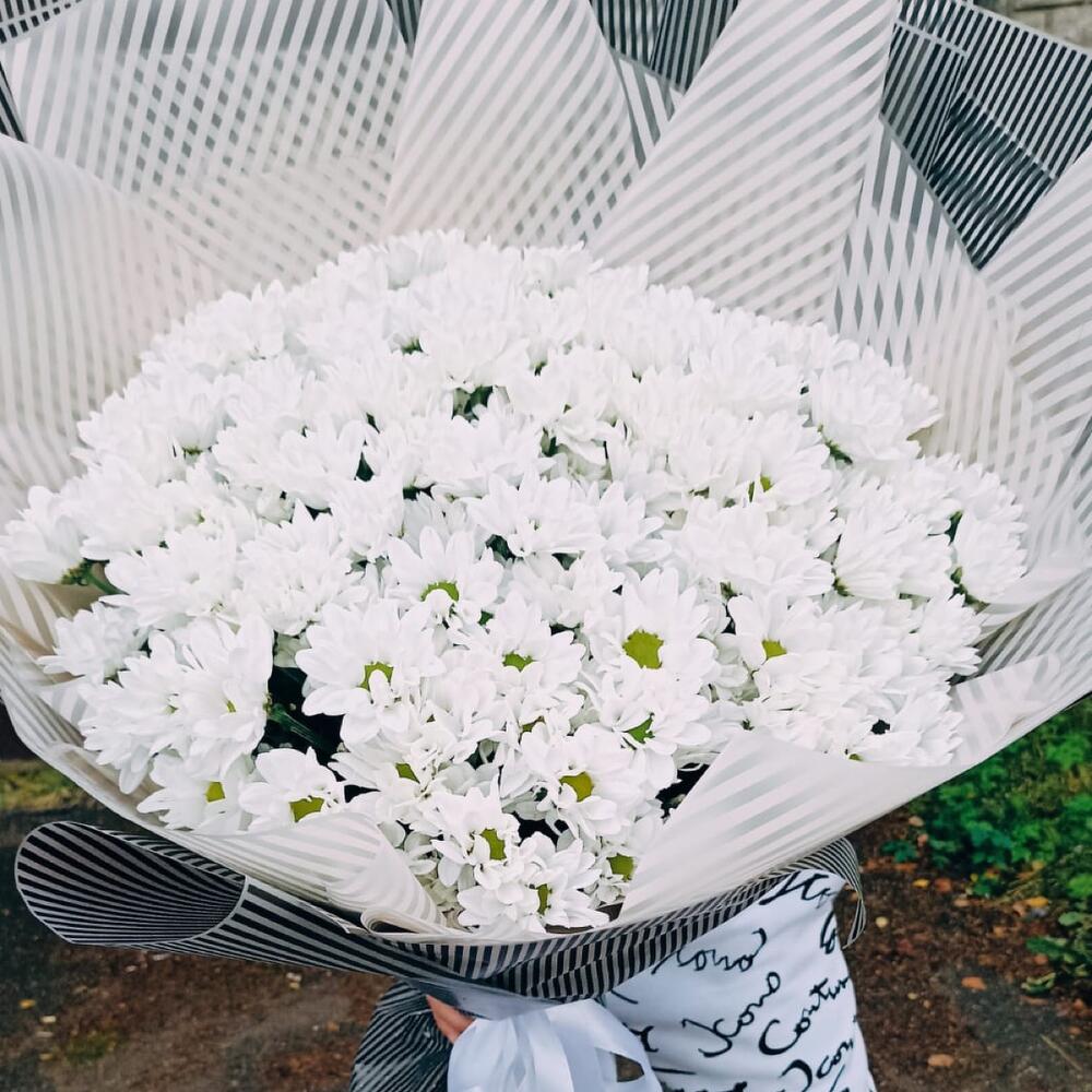 Лента атласная – 2 шт.Упаковка дизайнерская – 1 шт.хризантема кустовая кеннеди – 25 шт.