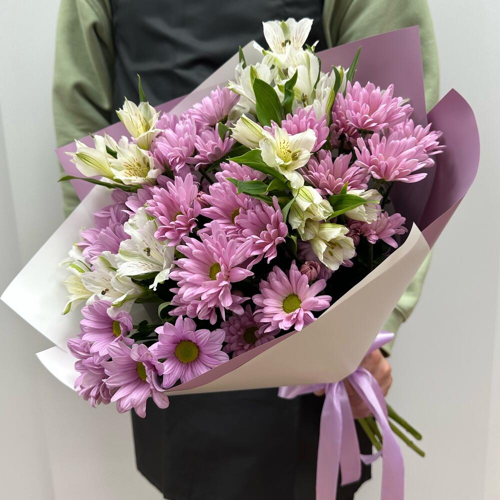 Альстромерия – 4 шт.Лента атласная – 1 шт.Упаковка дизайнерская – 1 шт.Хризантема кустовая цветная – 5 шт.