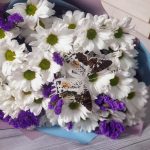 Хризантема кустовая – 7 шт.Лента атласная – 1 шт.Статица синяя – 4 шт.Пленка матовая – 2 шт.Открыточка с вашими пожеланиями – 1 шт.Бабочка декоративная – 1 шт.