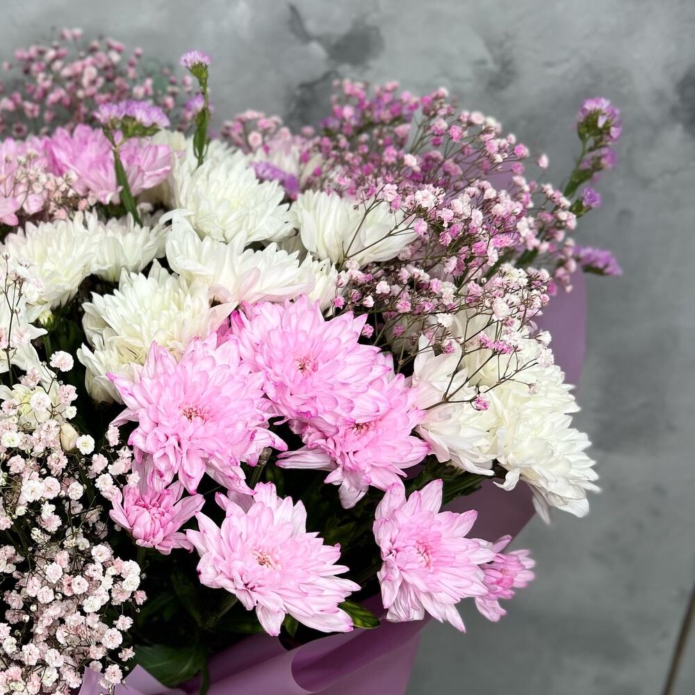 Хризантема кустовая – 13 шт.Статица – 2 шт.гипсофила радужная – 3 шт.Лагурус (сухоцвет) – 5 шт.Упаковка дизайнерская – 2 шт.Лента атласная – 2 шт.