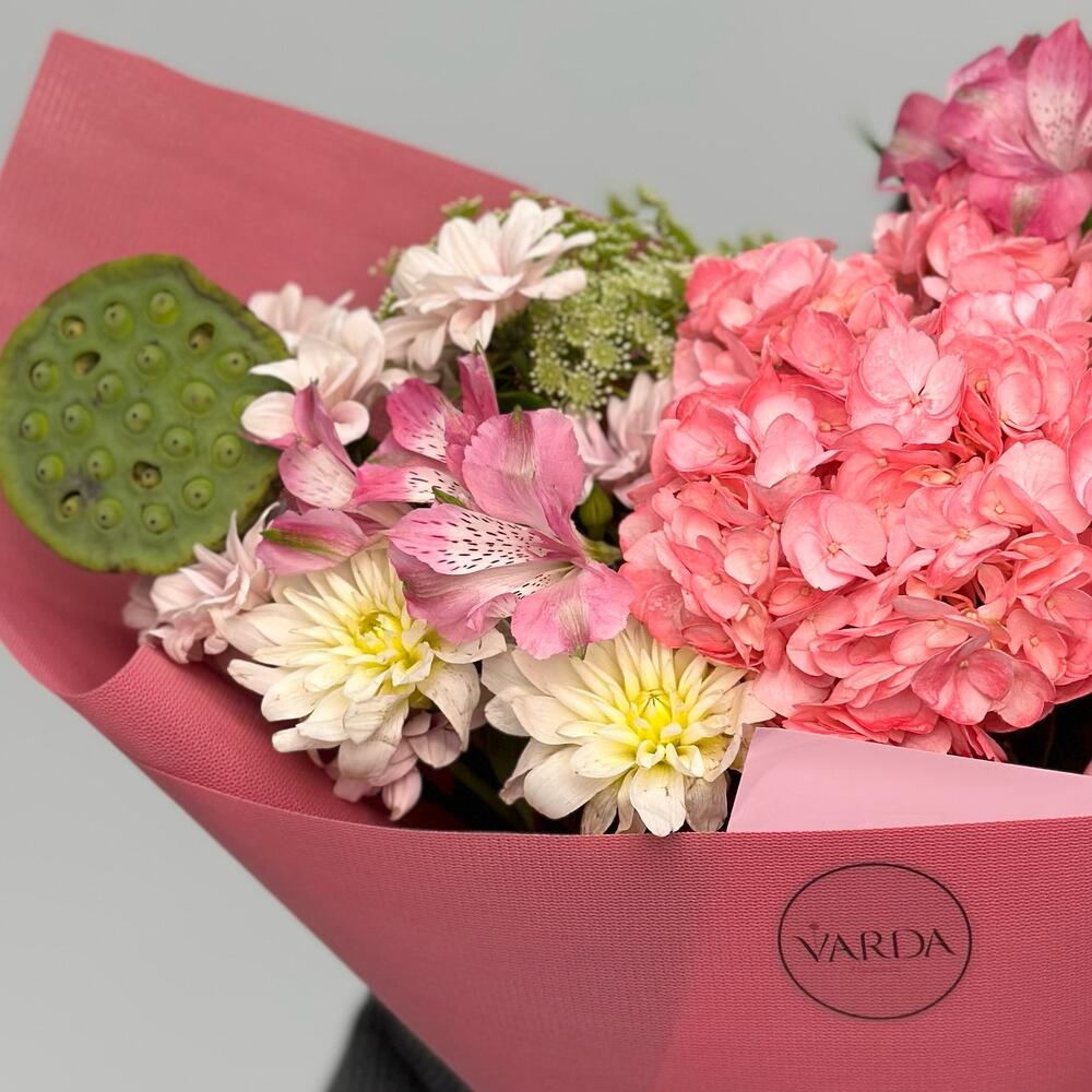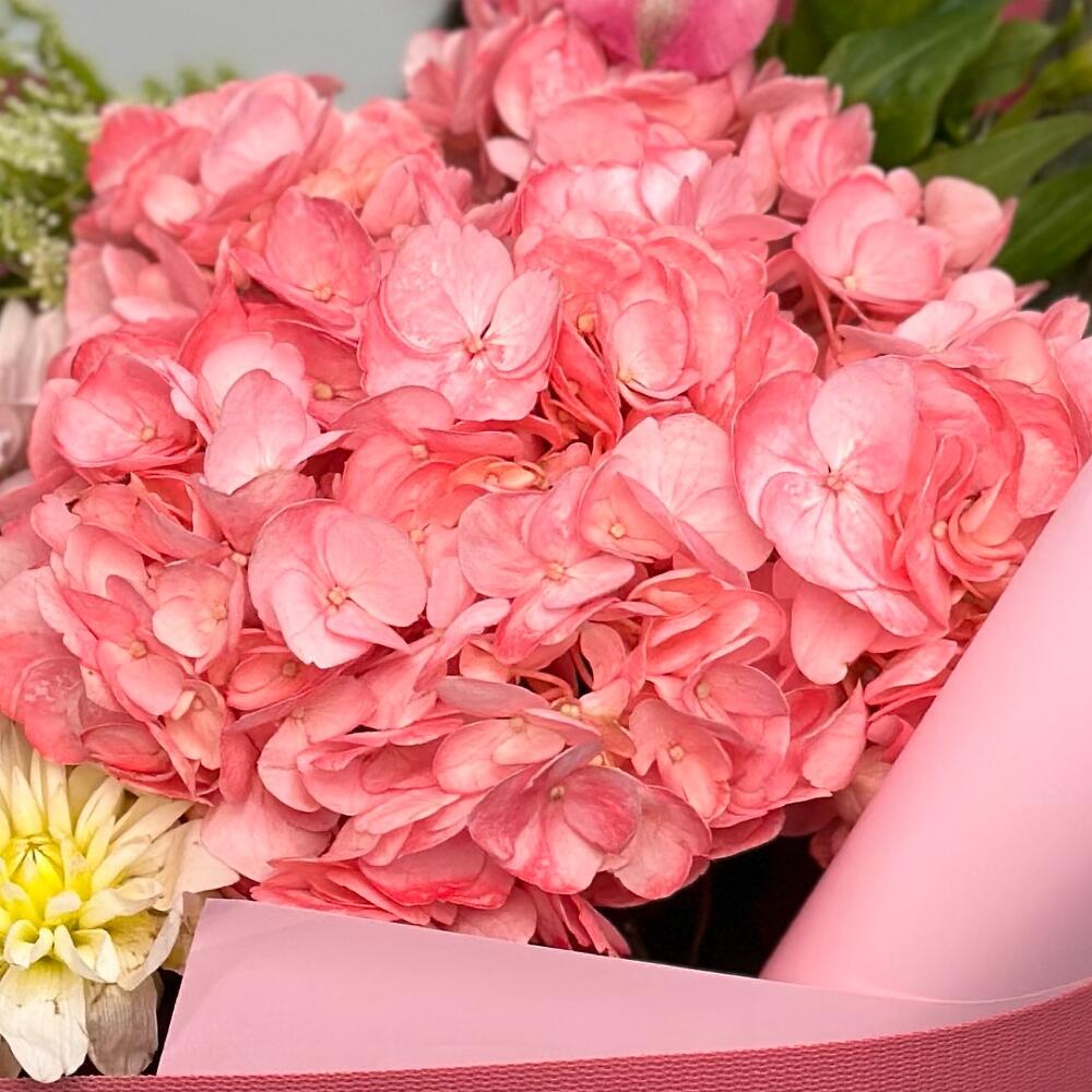 Альстромерии, Гортензии, Кустовые розы, Лизиантусы, Розы, Хризантемы