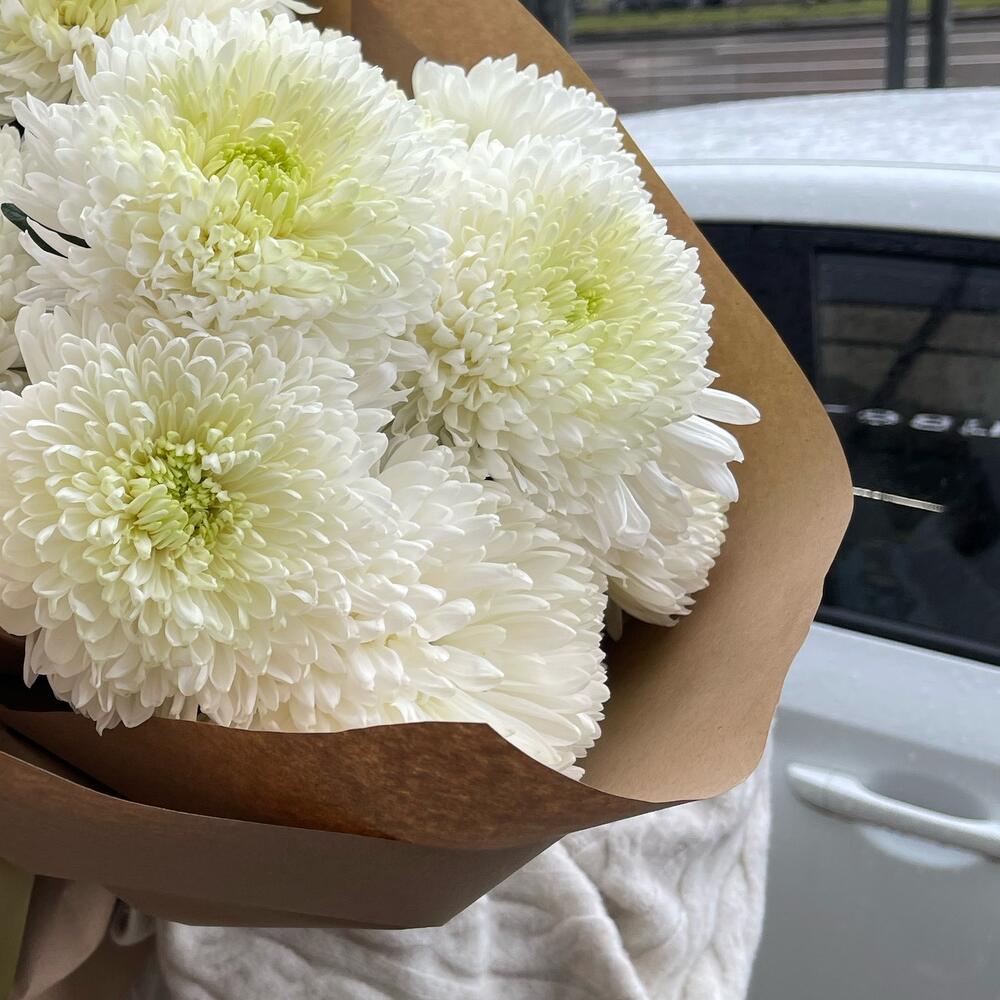 Хризантема – 15 шт.Лента атласная – 3 шт.Крафт дизайнерский – 4 шт.