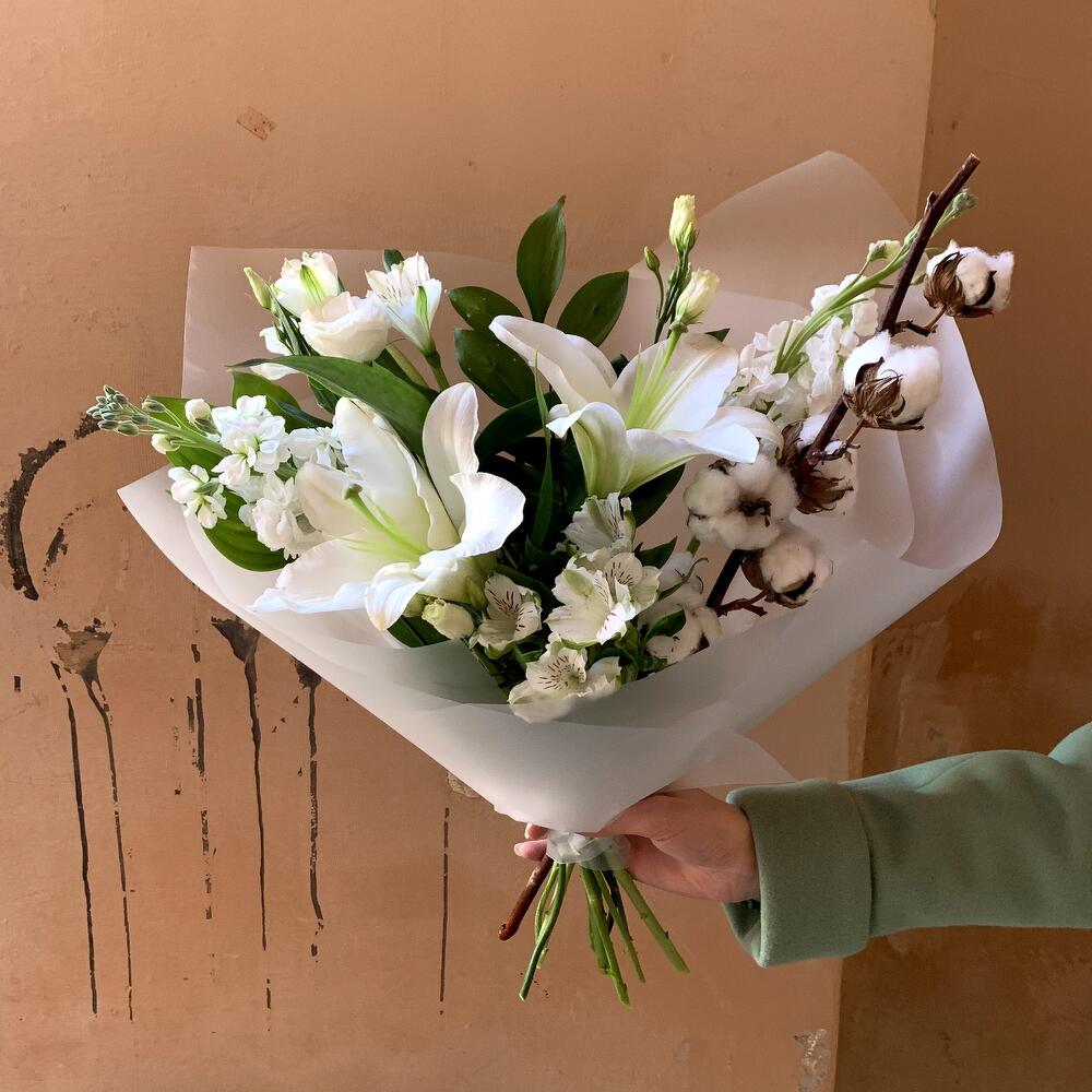 Альстромерия – 2 шт.Маттиола – 2 шт.Лилия белая – 1 шт.Лизиантус белый – 1 шт.Рускус сочи – 3 шт.Хлопок ветка – 1 шт.Авторская упаковка – 1 шт.