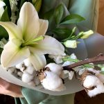 Авторский букет “Душистый горошек” с белой лилией, хлопком и лизиантусом