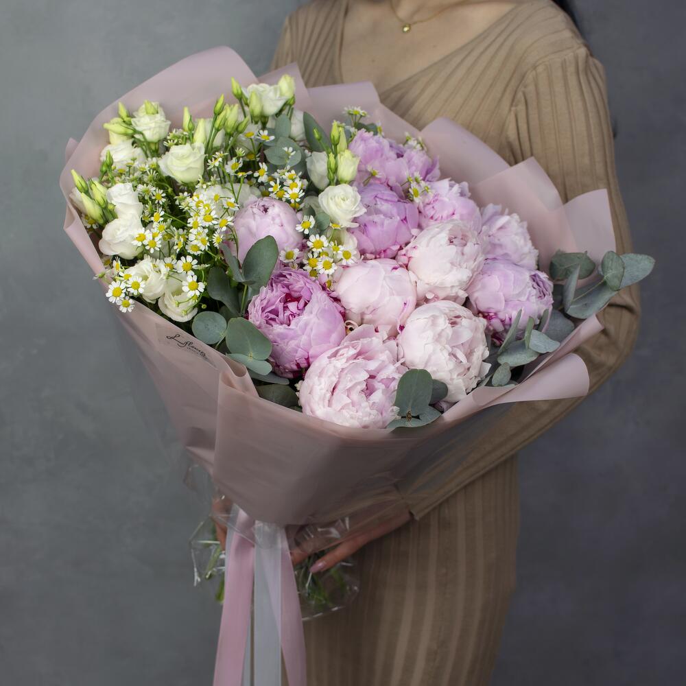 Летний микс с розовыми пионами, лизиантусами и ромашкой.