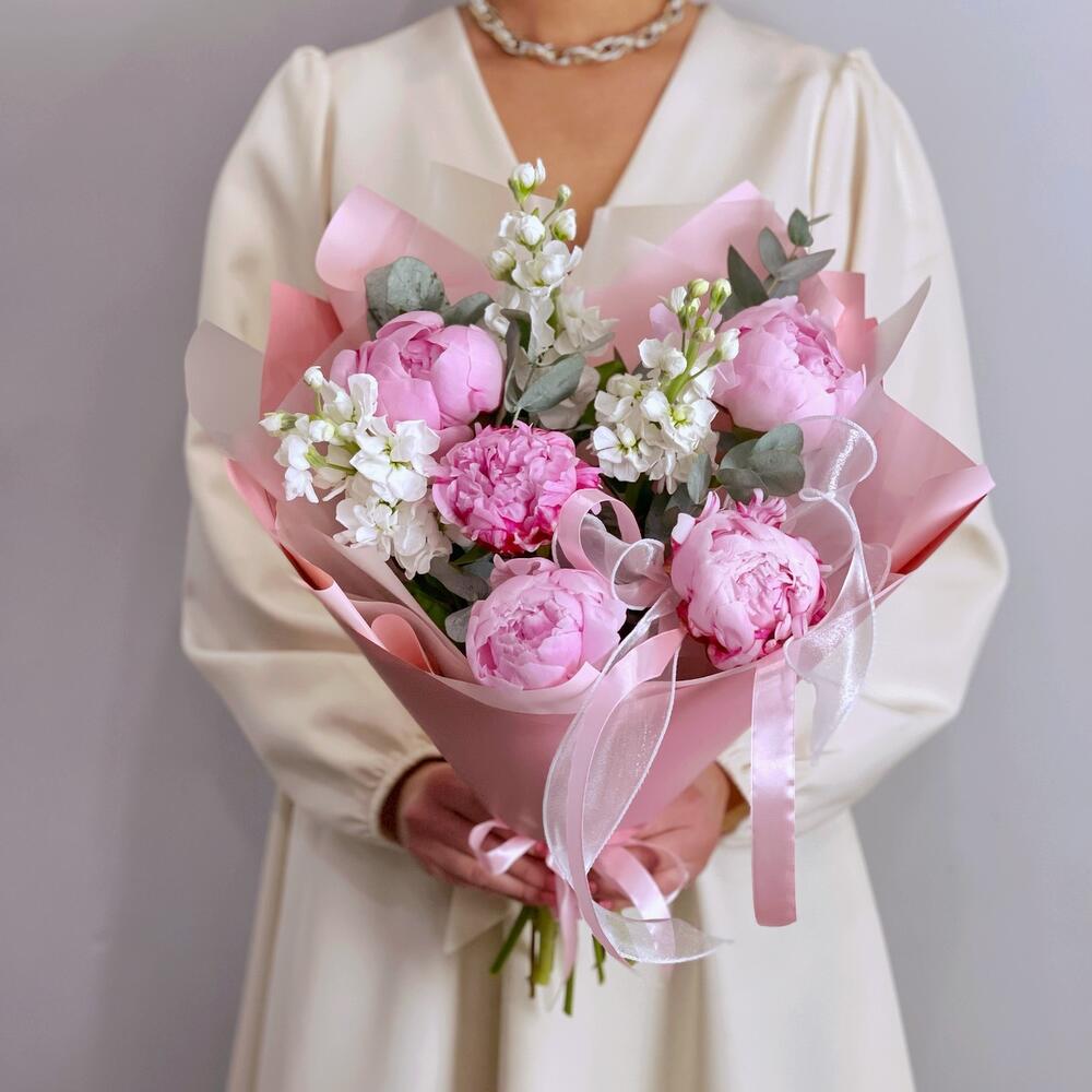 розовые пионы сара бернар – 5 шт.белая маттиола – 3 шт.Эвкалипт – 1 шт.Упаковка дизайнерская – 1 шт.