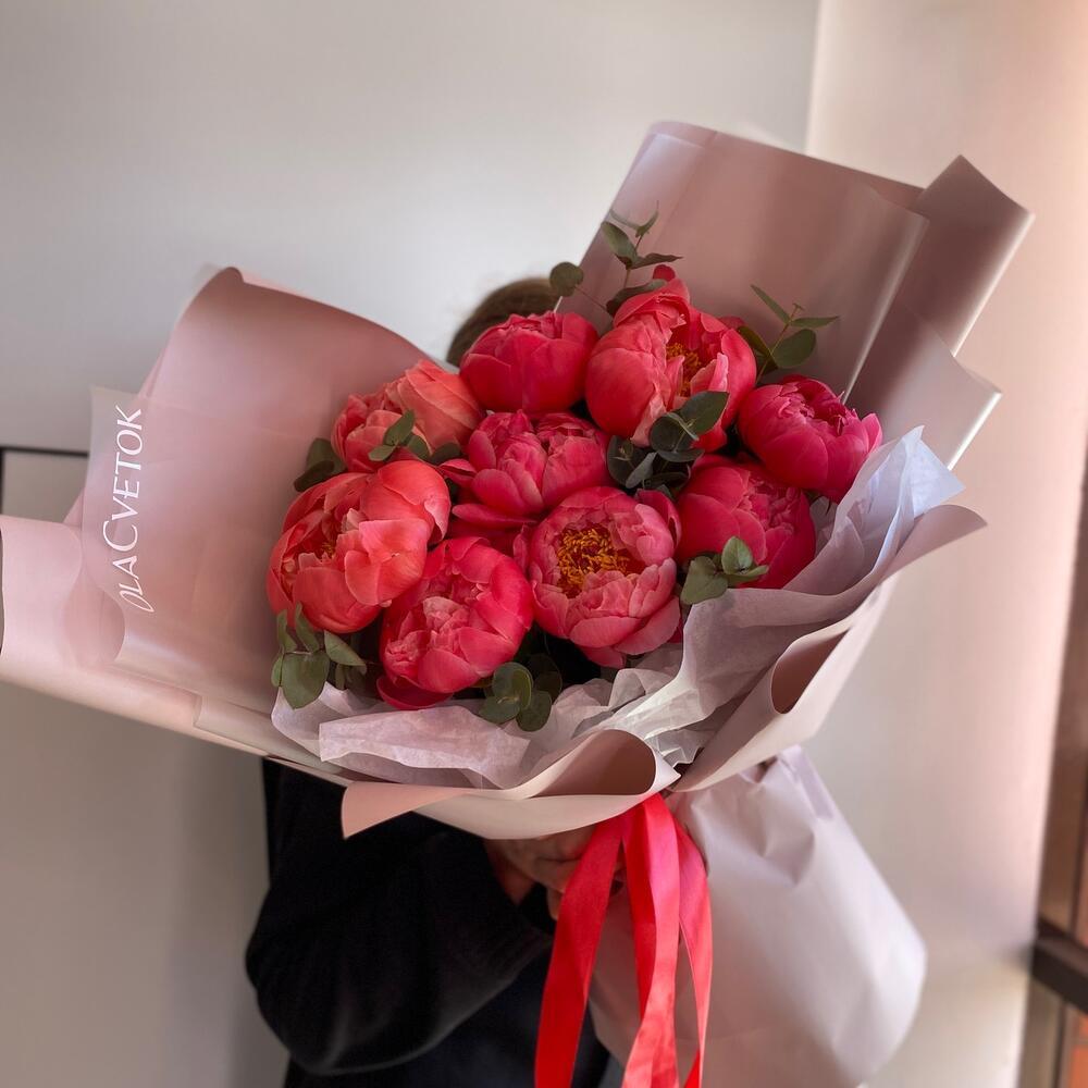 Яркие пионы коралл- шарм , в стильной упаковке от наших флористов ❤️