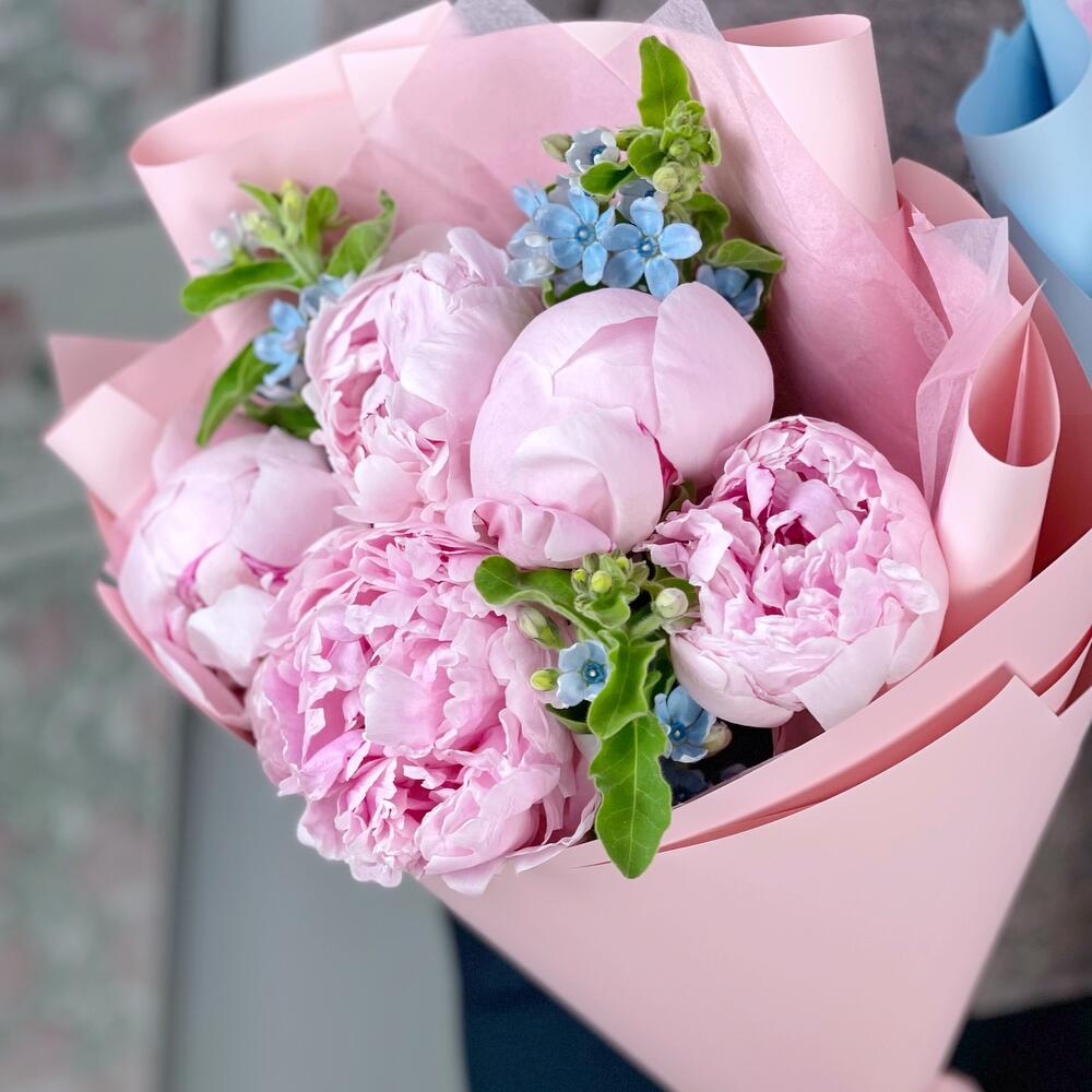 Пион – 5 шт.оксипеталум голубой – 3 шт.Упаковка дизайнерская – 1 шт.