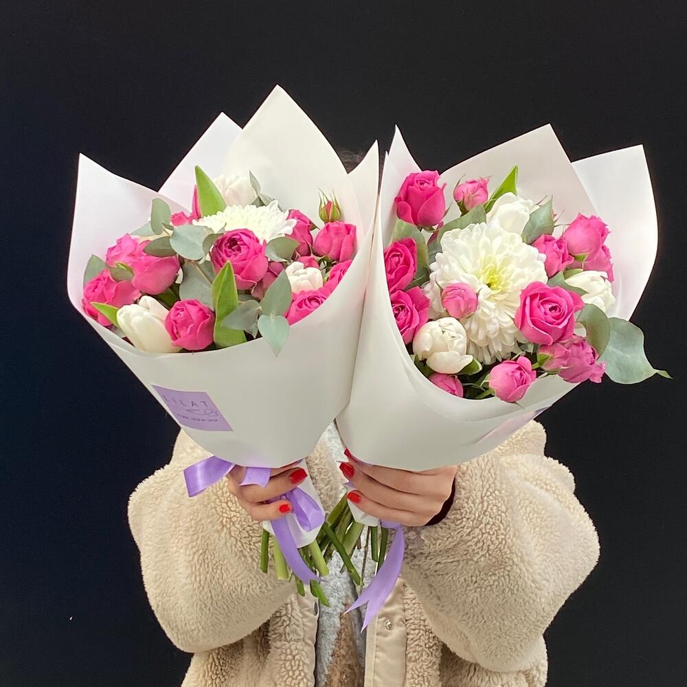 Кустовая роза – 10 шт. Тюльпан – 7 шт. Хризантема кустовая – 2 шт. Эвкалипт – 3 шт. Открыточка с вашими пожеланиями – 1 шт.