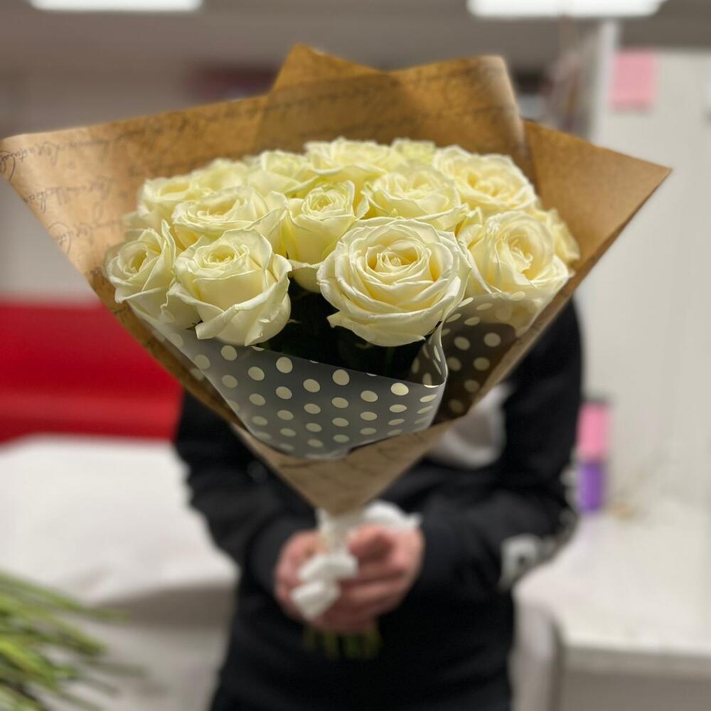 Роза – 15 шт.Крафт упаковка – 2 шт.Лента – 1 шт.