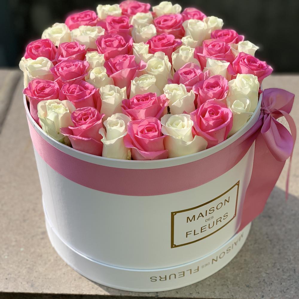 45 роз розовых и белых в коробке