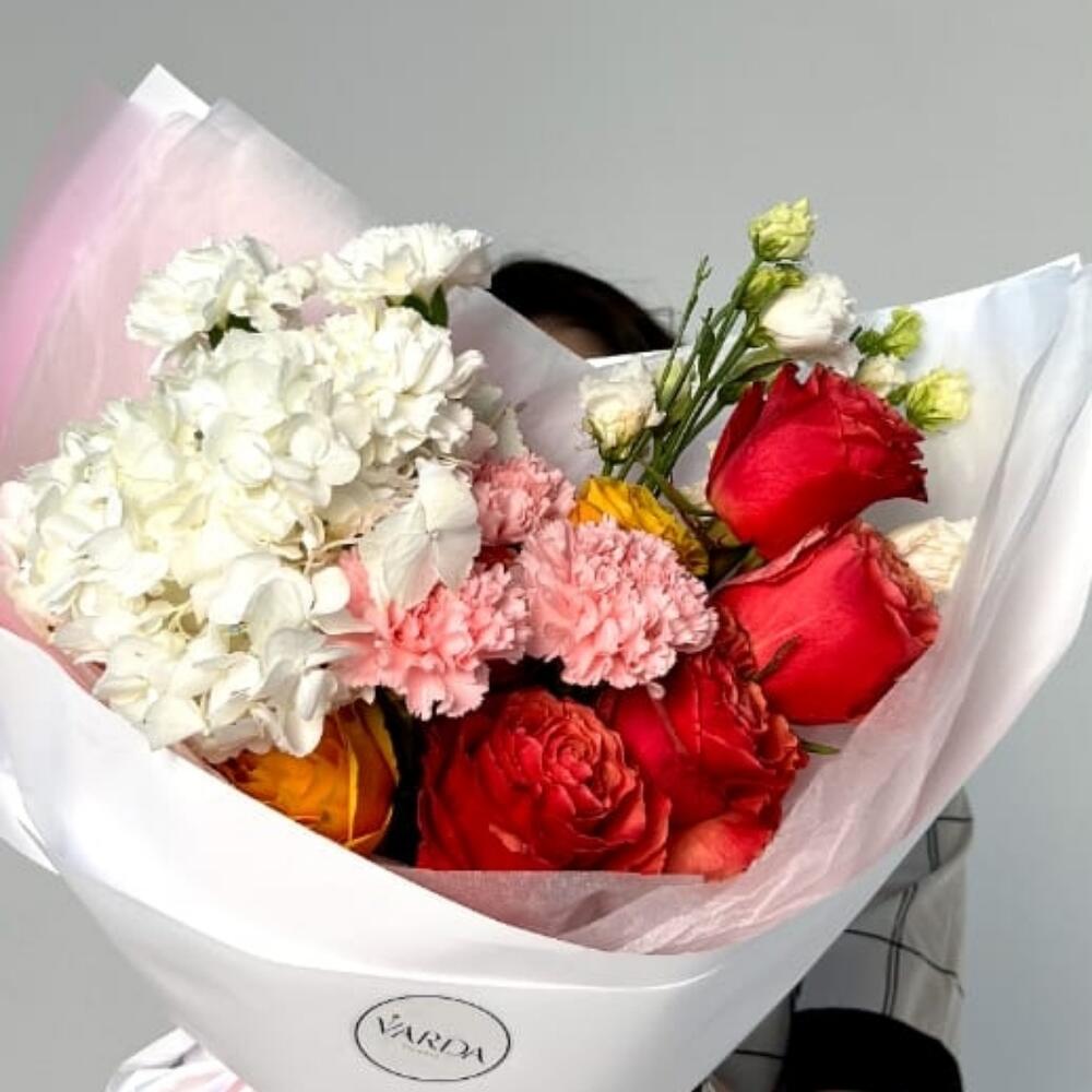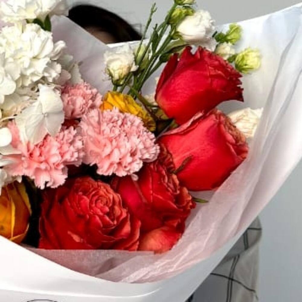 Альстромерии, Гвоздики, Кустовые розы, Лизиантусы, Розы, Хризантемы