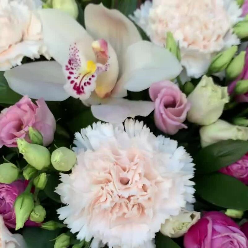 Орхидея Цимбидиум – 8 шт.Диантус – 9 шт.Роза кустовая – 3 шт.Лизиантус – 7 шт.Упаковка дизайнерская – 1 шт.Лента атласная – 1 шт.