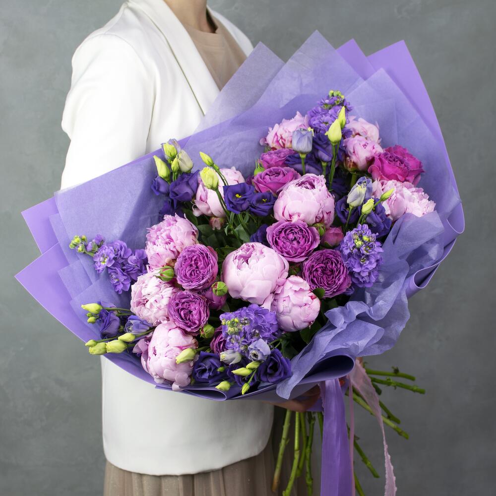 пионы сара бернардт – 9 шт.Маттиола фиолетовая – 4 шт.Лизиантус синий – 5 шт.Кустовая роза misty bubbles – 4 шт.