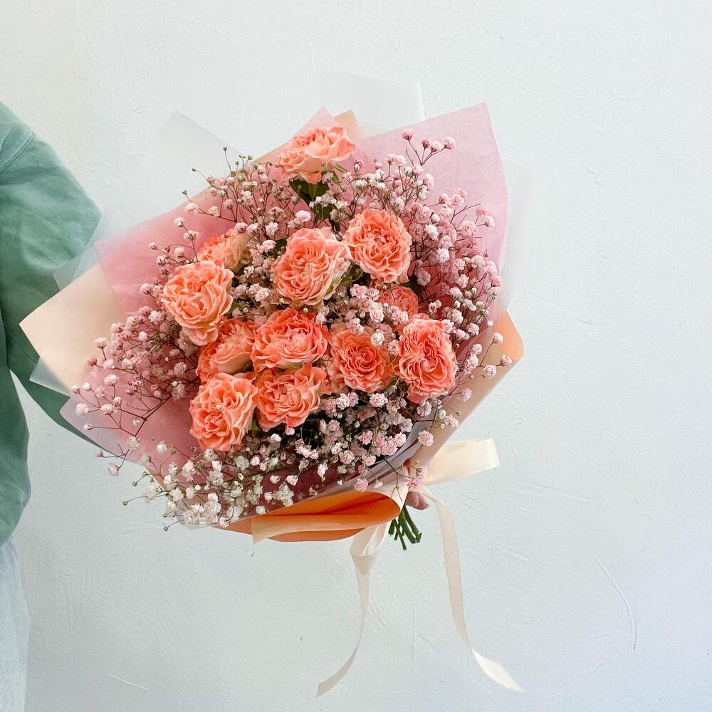 Букет из кустовой пионовидной розы и гипсофилы