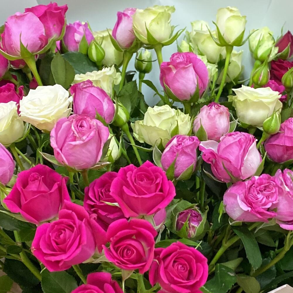 Лента – 4 шт. Роза кустовая – 15 шт. Тишью – 2 шт. Слюда упаковка – 2 шт. салфетка декоративная – 5 шт.