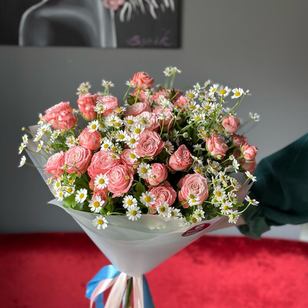 Букет из кустовой розы Бомбастик и Ромашки Матрикарии
