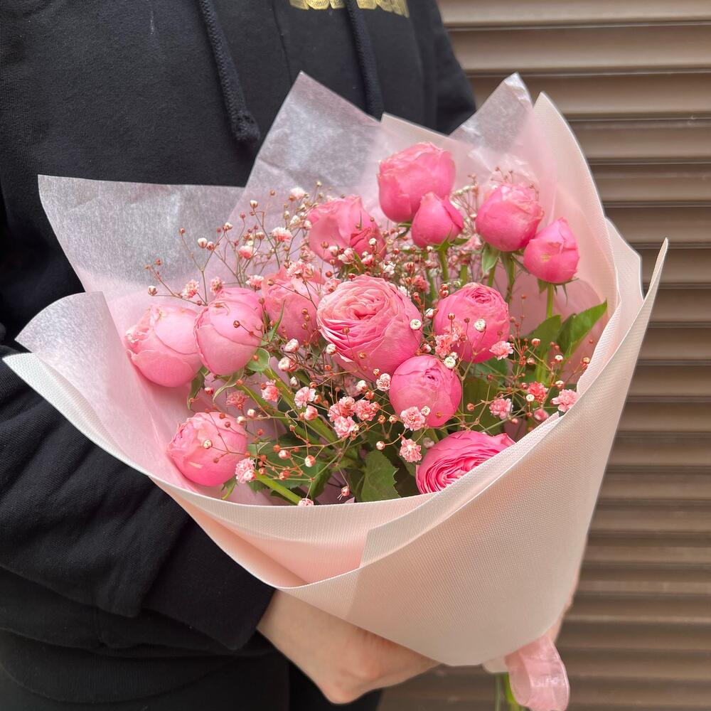 сильва пинк кустовая роза – 3 шт.Гипсофила – 2 шт.Пленка матовая – 1 шт.