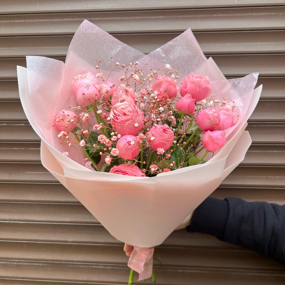 Букет из пион розы и гипсофилы