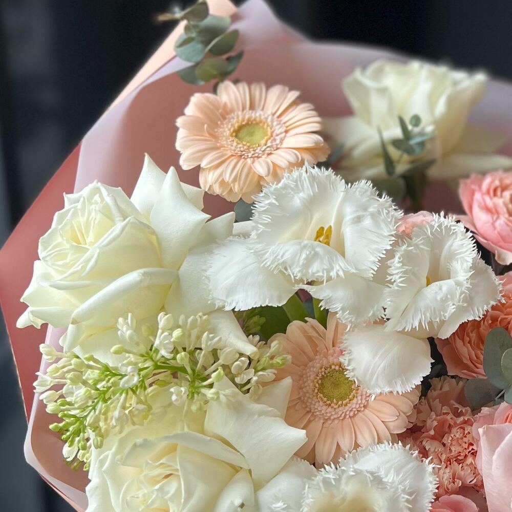 Кустовая пионовидная роза – 2 шт.Одноголовая роза – 6 шт.Гербера – 3 шт.Тюльпан – 3 шт.Озотамнус – 1 шт.Сирень – 1 шт.Эвкалипт – 3 шт.декоративная упаковка – 1 шт.Атласная лента – 1 шт.