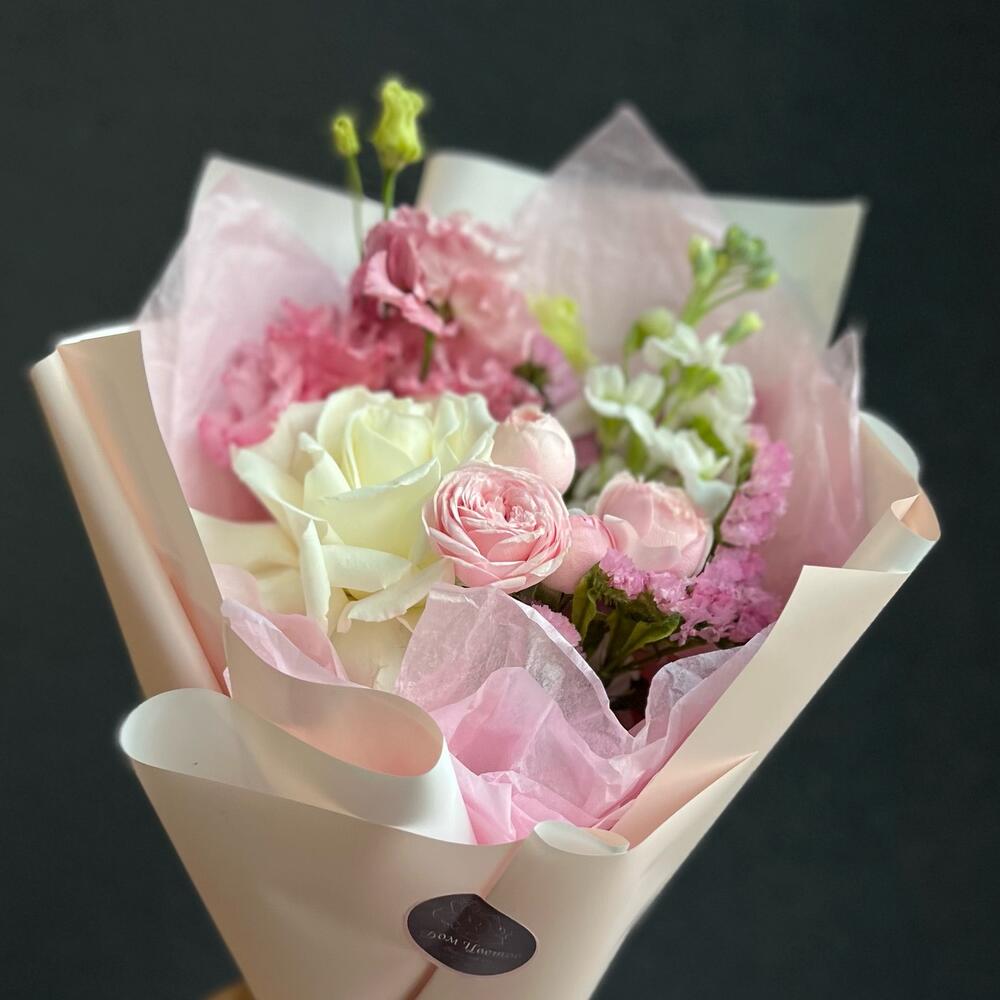Маттиола – 1 шт.Статица – 1 шт.Атласная лента – 1 шт.Кустовая пионовидная роза – 1 шт.Одноголовая роза – 1 шт.декоративная упаковка – 1 шт.