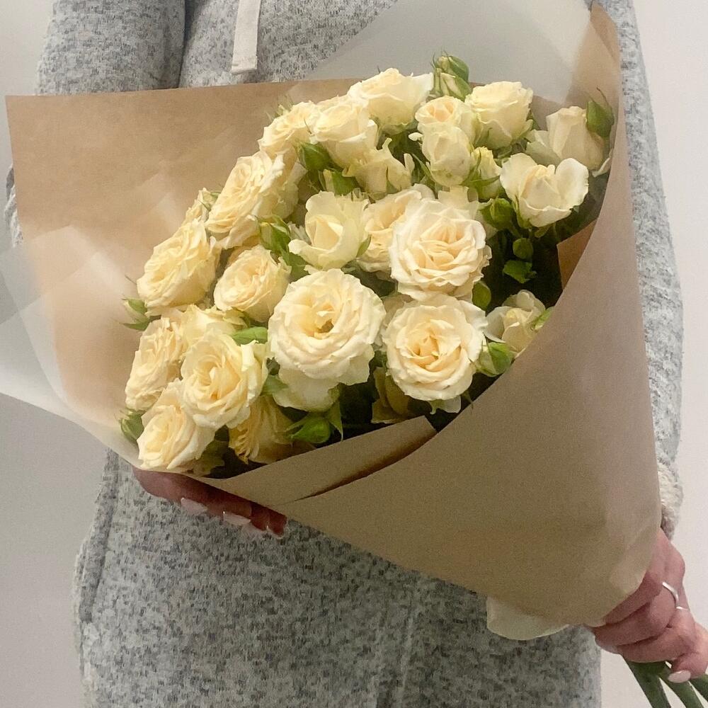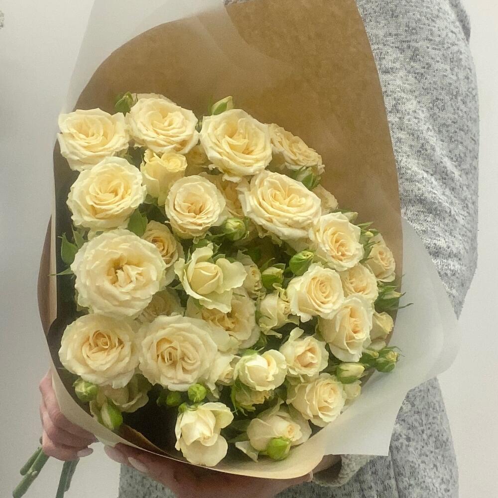 кустовые розы – 5 шт.Упаковка – 2 шт.Лента – 1 шт.