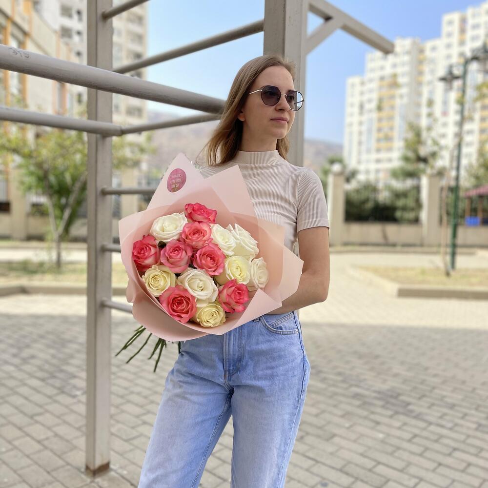 Упаковка – 1 шт. Атласная лента – 1 шт. белые и розовые розы – 15 шт.