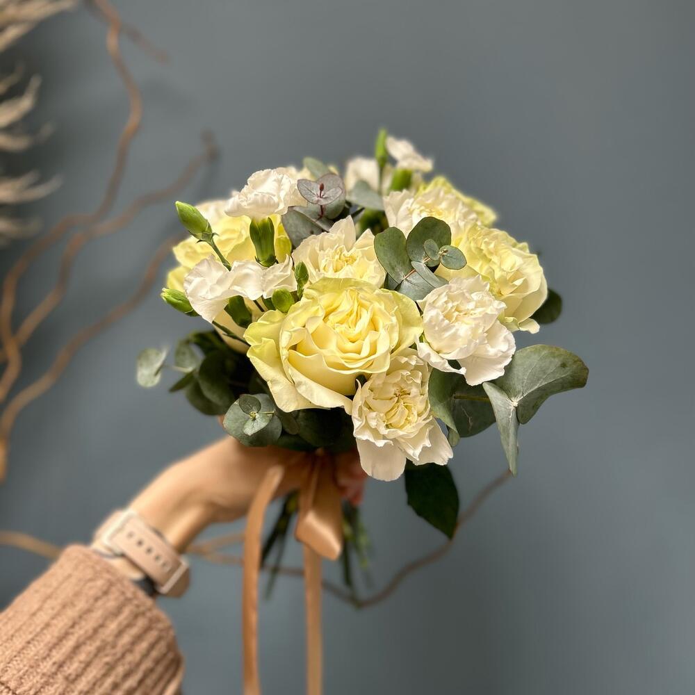 Эвкалипт – 1 шт.гвоздика соломио – 3 шт.Гвоздика – 7 шт.Роза Мондиаль – 5 шт.Лента атласная – 1 шт.