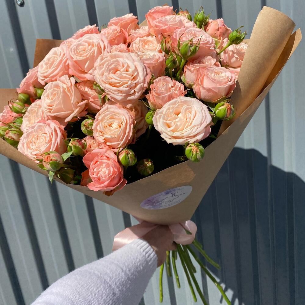 Лента атласная – 1 шт.Крафт упаковка – 1 шт.Роза кустовая пионовидная бомбастик – 10 шт.