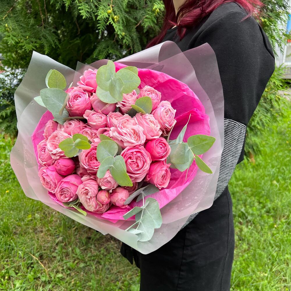 Роза пионовидная кустовая – 11 шт.Эвкалипт – 5 шт.Тишью – 2 шт.Пленка матовая – 2 шт.
